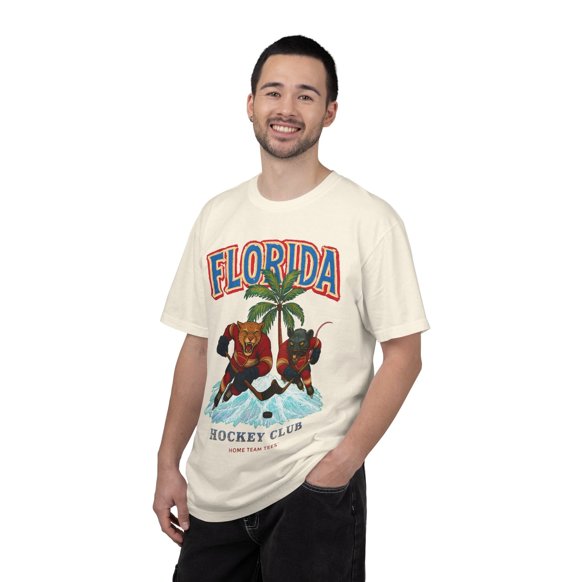 This heavyweight tee brings a vintage, game-day energy to everyday wear. We print on the “Comfort Colors 1717” garment-dyed t-shirt, a premium tee made with 100% ring-spun cotton. The soft-washed, garment-dyed fabric brings extra comfort to your wardrobe while the relaxed fit makes it an excellent daily choice. The double-needle stitching throughout the tee makes it highly durable, while the lack of side seams helps the shirt retain its tubular shape. We use Direct to Garment (DTG) printing, which perfectly complements our detailed and colorful designs. This tee suits fans who dig authentic, vintage-inspired hockey graphics and lasting shirt construction.